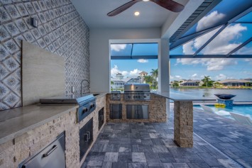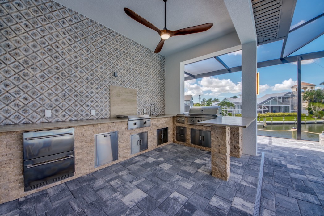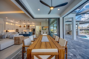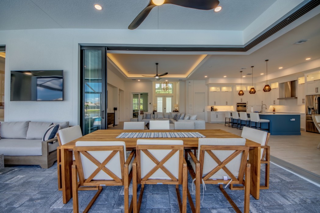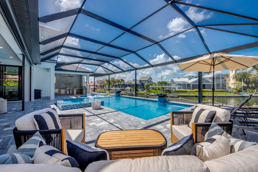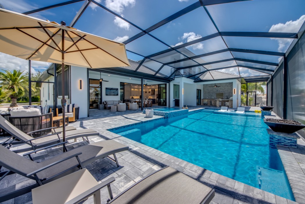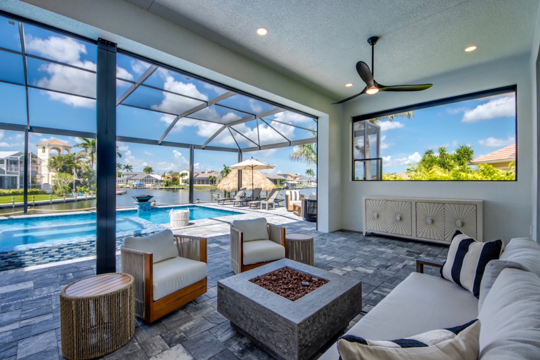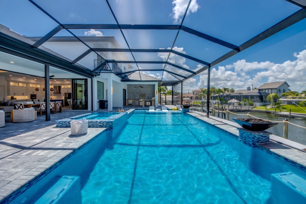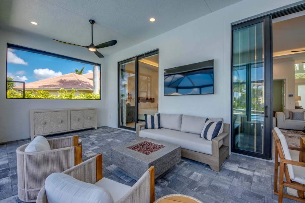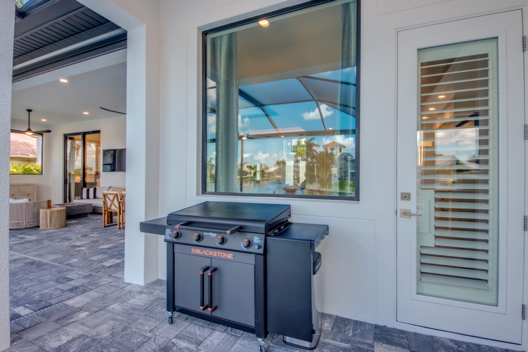 Step outside to the generously sized lanai, where a large heated pool and hot tub await - offering a private wellness retreat. The outdoor space also features a premium summer kitchen with an impressive granite countertop, perfect for preparing and enjoying barbecue meals in style. The entire lanai and pool area is enclosed with a screen, and sun loungers are provided for relaxing in the Florida sun. The highlight in the outdoor area are the 2 outdoor fire bowls right by the pool.